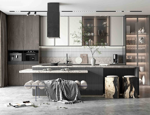 天然石材地板豪華高貴,防水耐溶,特別適合打造奢華風格的廚房,但要注意保持乾燥,以免損壞。