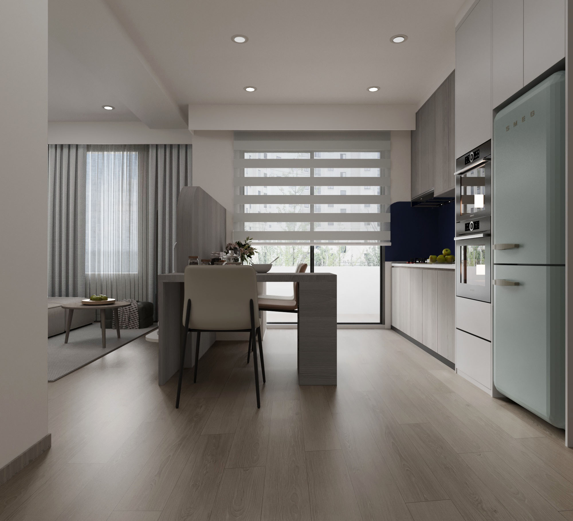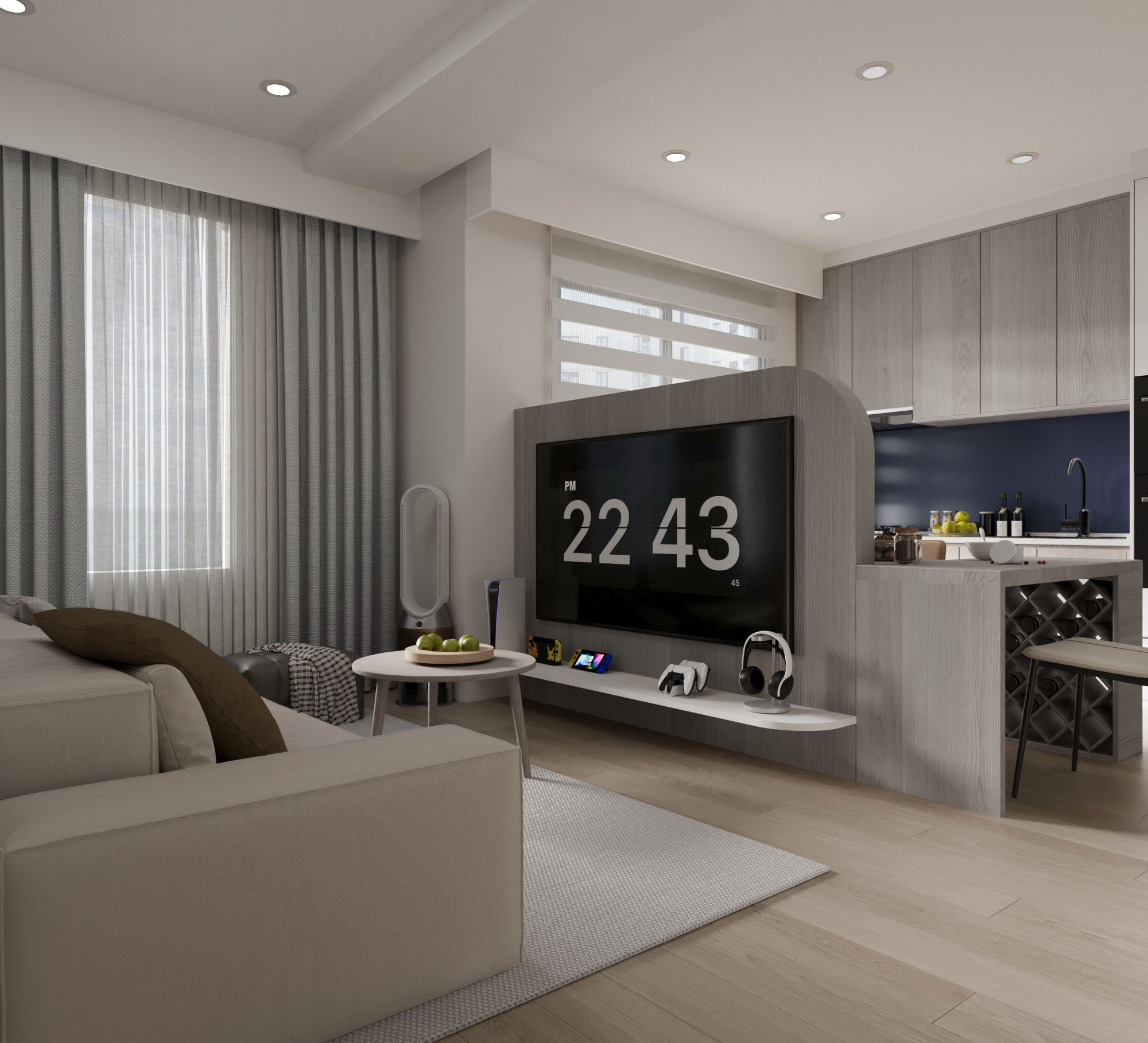 現代北歐風格的設計理念強調簡約與優雅。客餐廳的佈局創造了一個和諧的生活區域,餐桌與沙發的簡約設計相輔相成,提升了空間的舒適性與功能性。電視牆配有倒圓角的背板,為空間帶來柔和的視覺效果。落地窗引入了自然光,增強了空間的開放感,木質地板則為設計增添了溫馨與質感。廚房旁的窗簾增添了一份靈活性,兼顧了實用性與隱私保護。