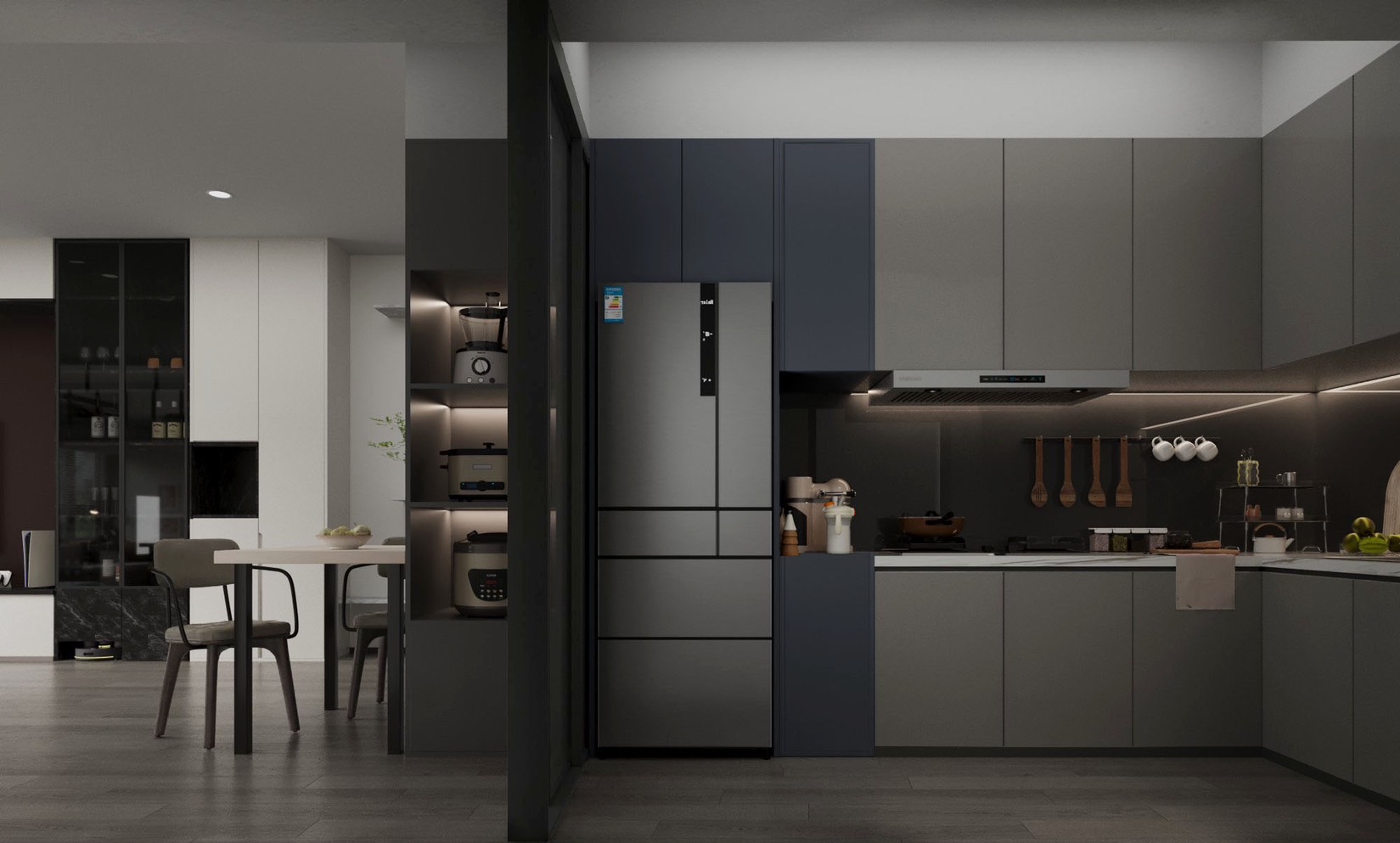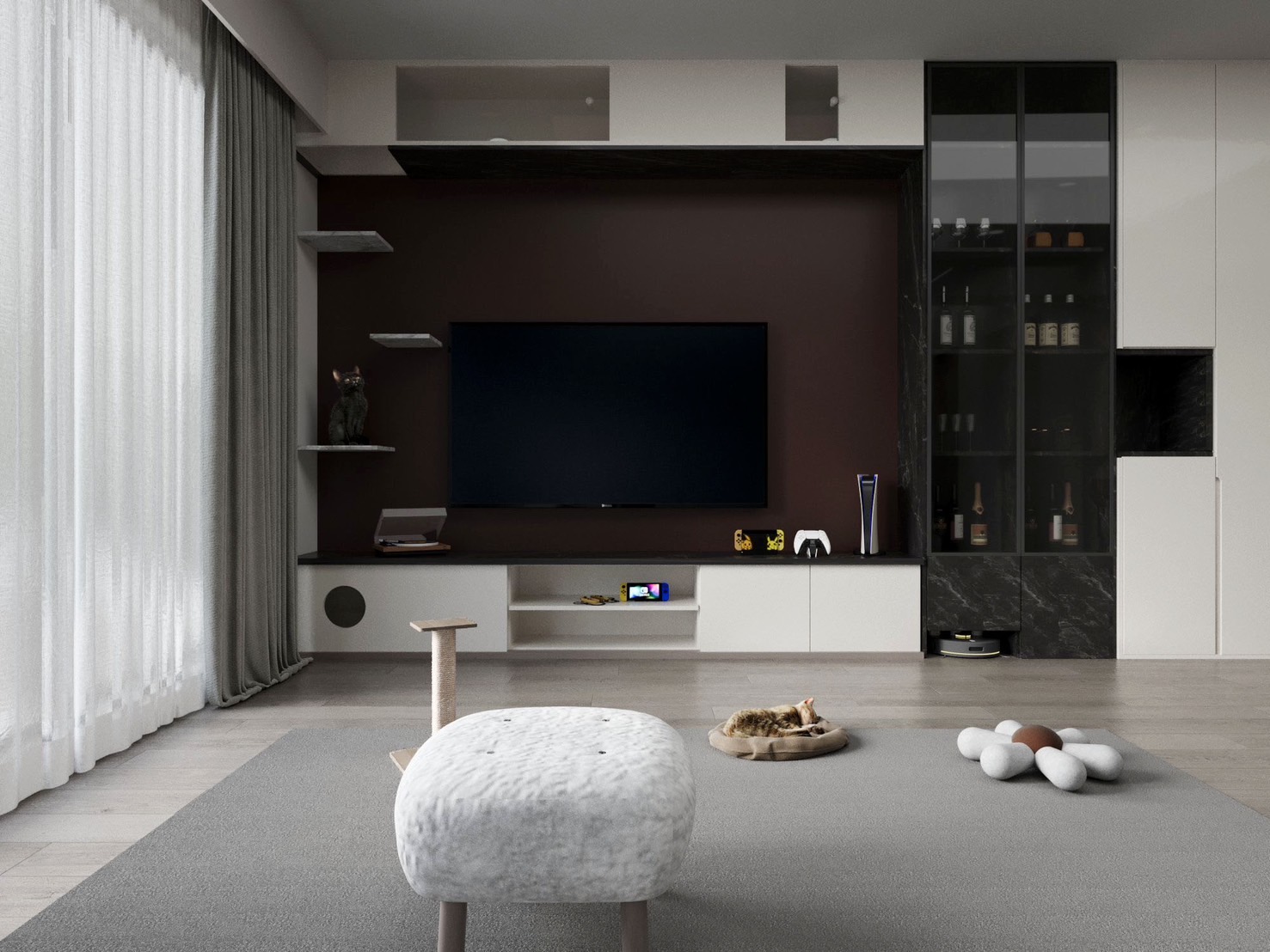 進入客廳,迎接您的是一扇優雅的鋁拉門。黑框和黑玻門片的材質展現出極致的現代簡約風格,巧妙地分隔了玄關與客廳,兼顧開放感與實用性。