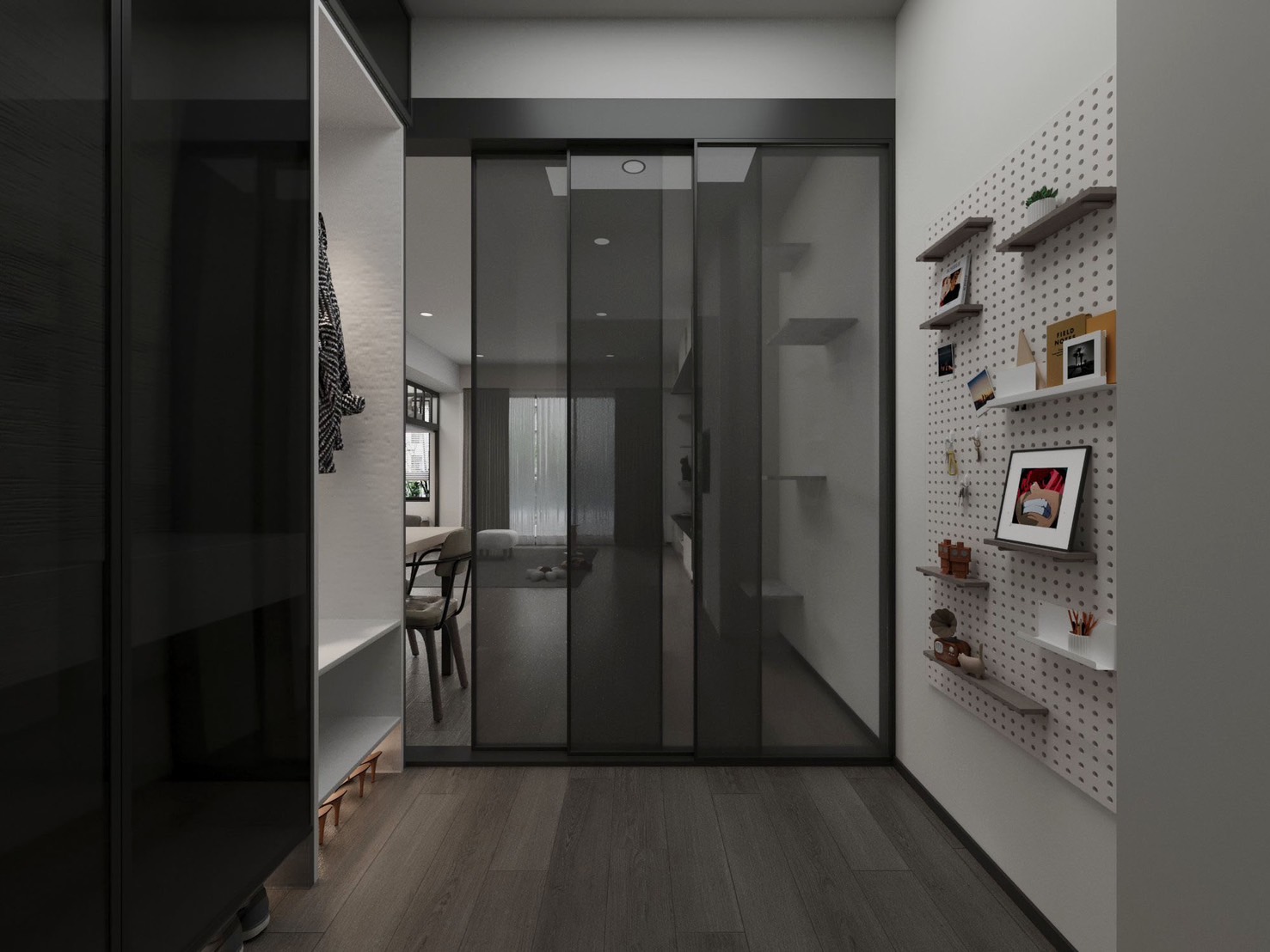 現代簡約風格的家居空間,首先映入眼簾的是精緻的玄關。灰白色調的牆面和地板散發清新氛圍。牆上的洞洞板不僅實用,還增添了現代藝術感。左側的懸空鞋櫃設計方便存放鞋履及懸掛外衣,保持整潔。