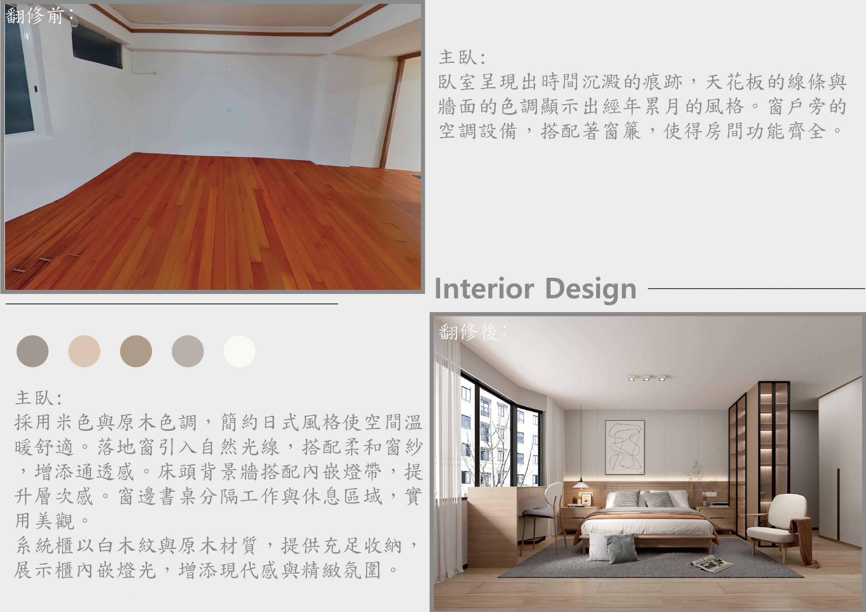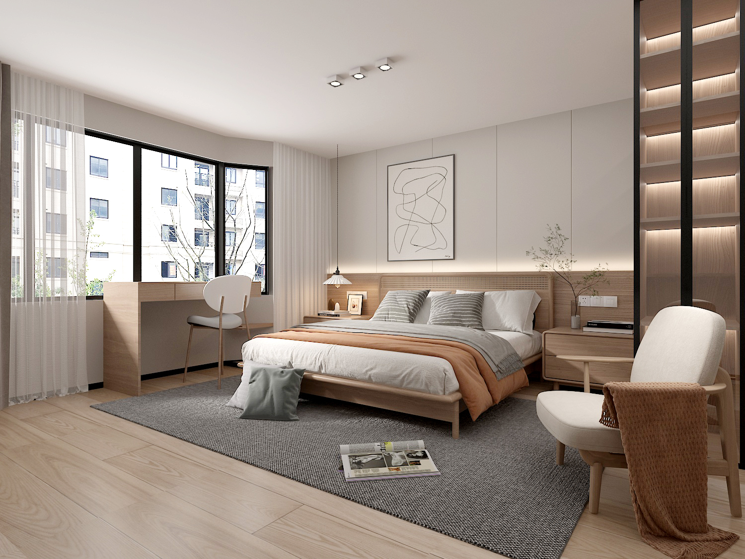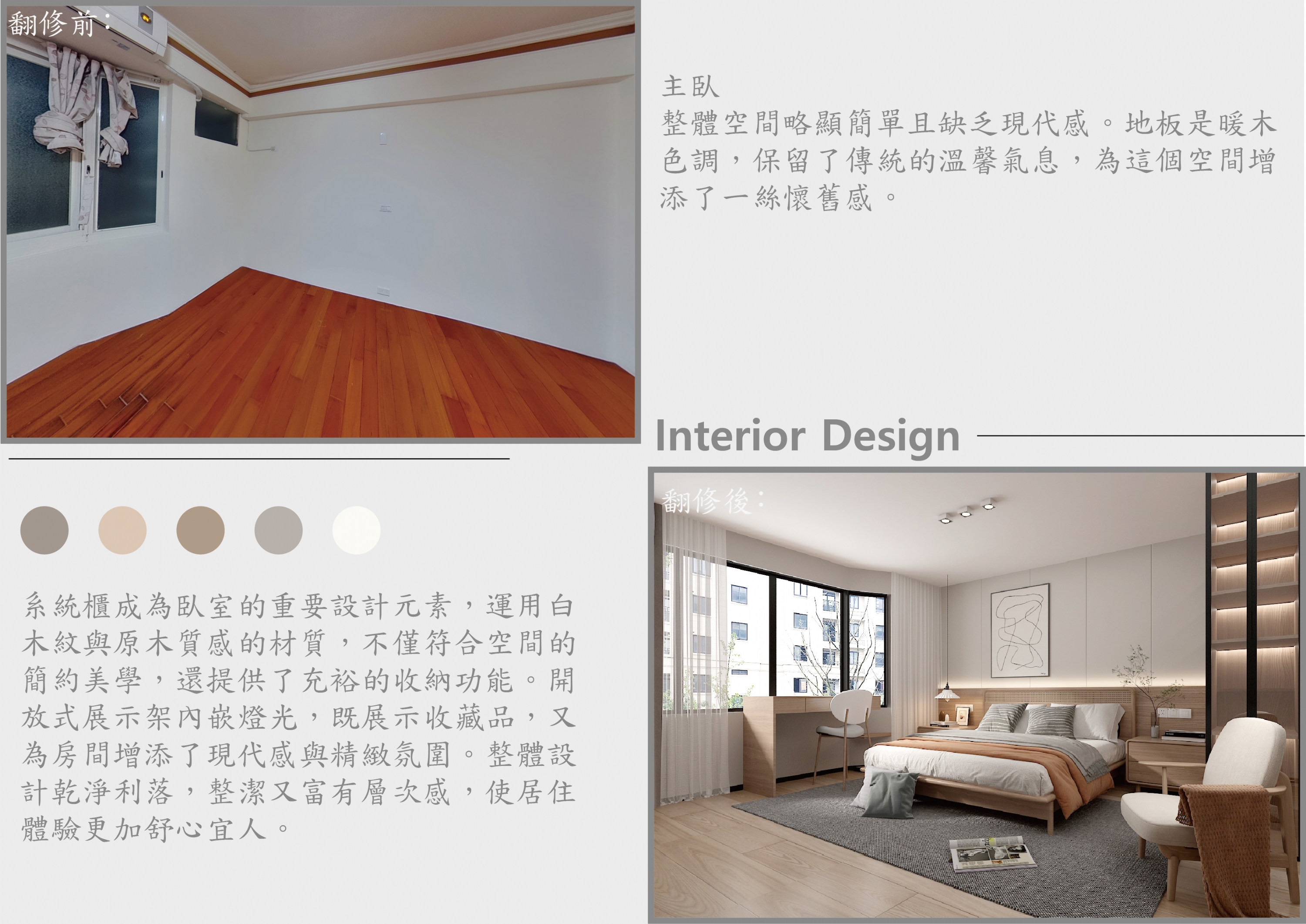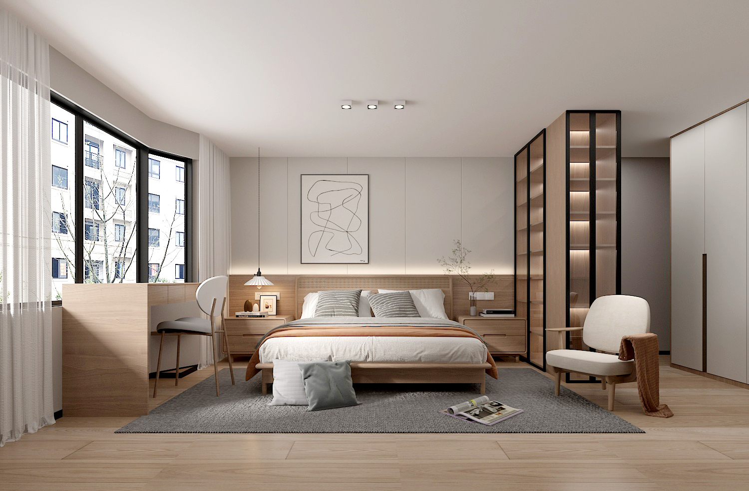 以米色與日式奶茶色系為主,營造溫潤柔和的氛圍。搭配系統板與收納櫃體,讓空間更加井然有序且實用。窗邊設置的書桌提供自然光源,不僅增加功能性,還提升了整體的舒適感。這樣的設計,將寧靜與雅致融入生活,使臥室成為一個放鬆與沉澱心靈的理想場所。