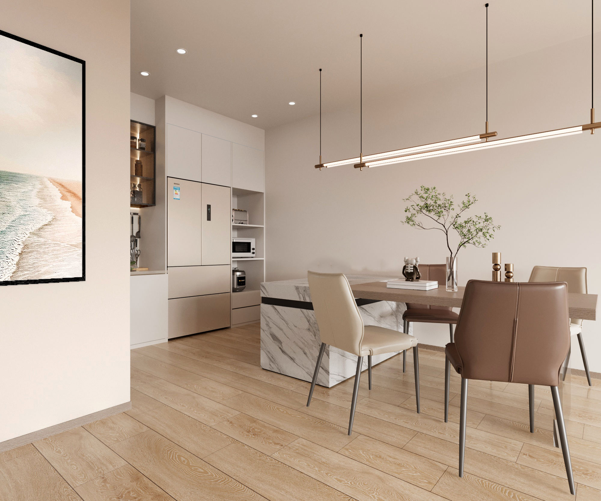 展現了現代與自然元素的和諧結合。淺色木質地板帶來溫暖而自然的感覺,搭配大理石紋理的中島與簡約流線的餐桌椅,營造出舒適而精緻的用餐環境。純淨的色調與簡潔的家電設計,體現出極簡主義的美學,讓空間更顯寬敞明亮。