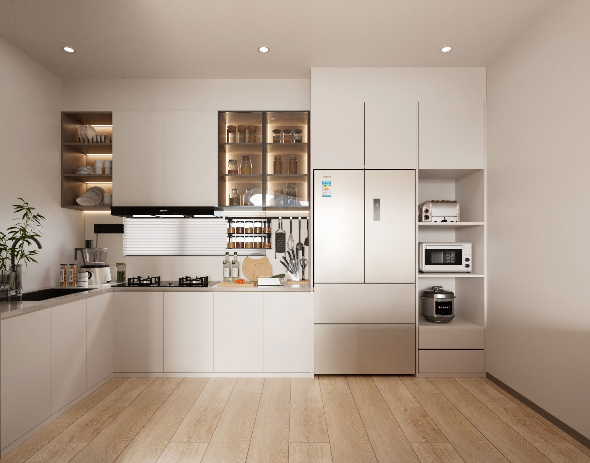 透過隱藏式收納系統,不僅能有效提升收納容量,還能維持廚房的整體視覺效果。大容量抽屜與多層層板為各式廚具提供專屬空間,避免雜亂無章。這樣的設計不僅強化了空間利用率,還提升了日常使用的便利性與舒適感。每個細節都經過精心考量。