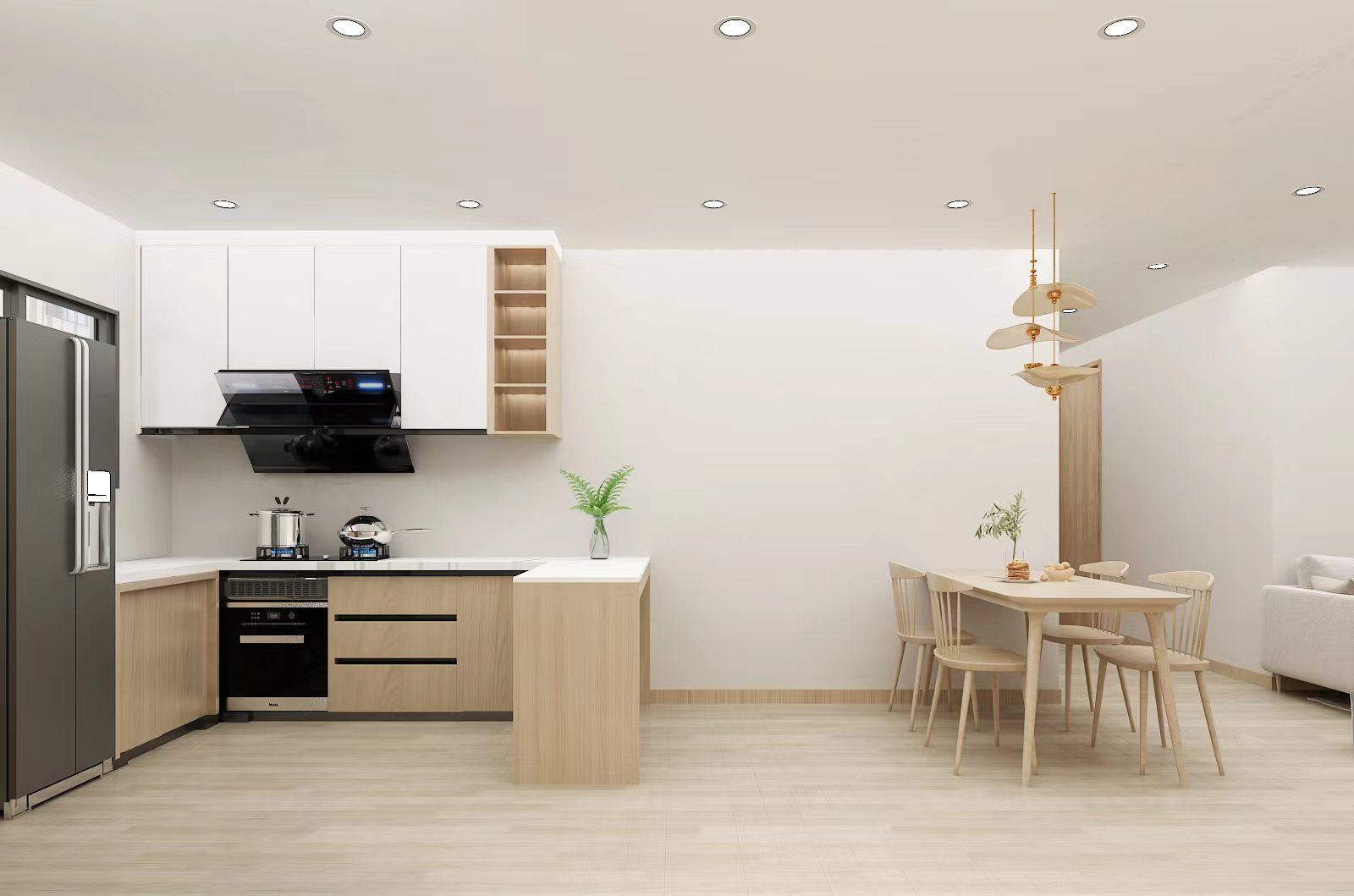 日式北歐風的餐廳設計注重舒適性與自然美感,採用開放的空間設計,讓用餐區與廚房或客廳無縫連接,增強社交感。選擇柔和的燈光設計,如吊燈或落地燈,創造溫馨的用餐氛圍;空間擺放一些室內植物,增添生氣和自然感,提升整體環境的舒適度。如此的設計不僅美觀,還能讓人感到放鬆和愉悅,非常適合家庭聚餐或朋友聚會。