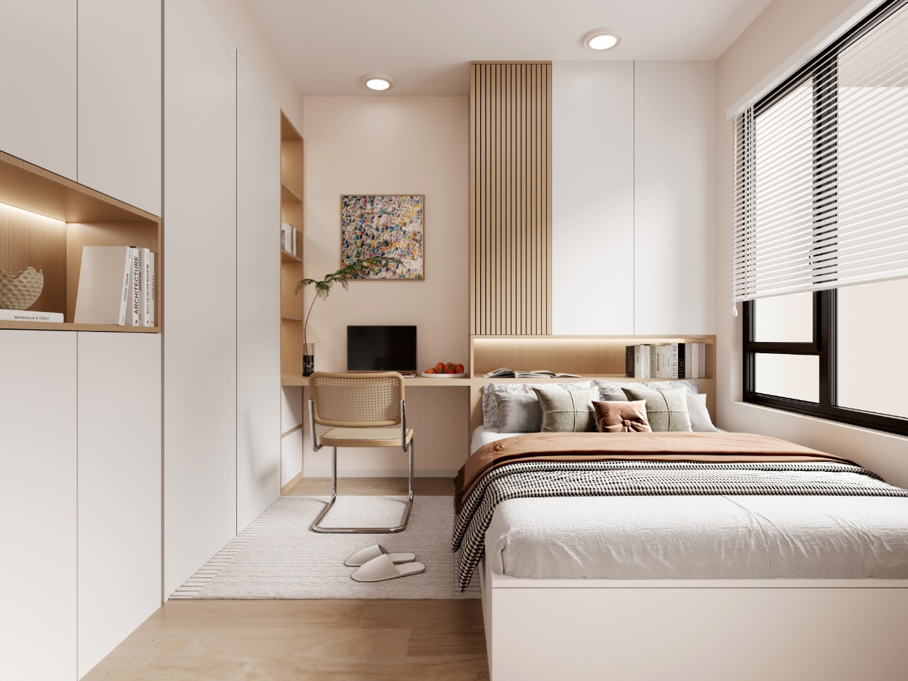 臥室設計延續日式無印的風格,採用溫潤的木質元素,搭配簡單且實用的收納空間,讓整體顯得清新舒適。床頭背景牆結合垂直的木質條紋與收納層架,兼具美觀與實用性。這裡,是讓人回到家的安心角落,完美詮釋簡約而不失溫度的設計語彙。