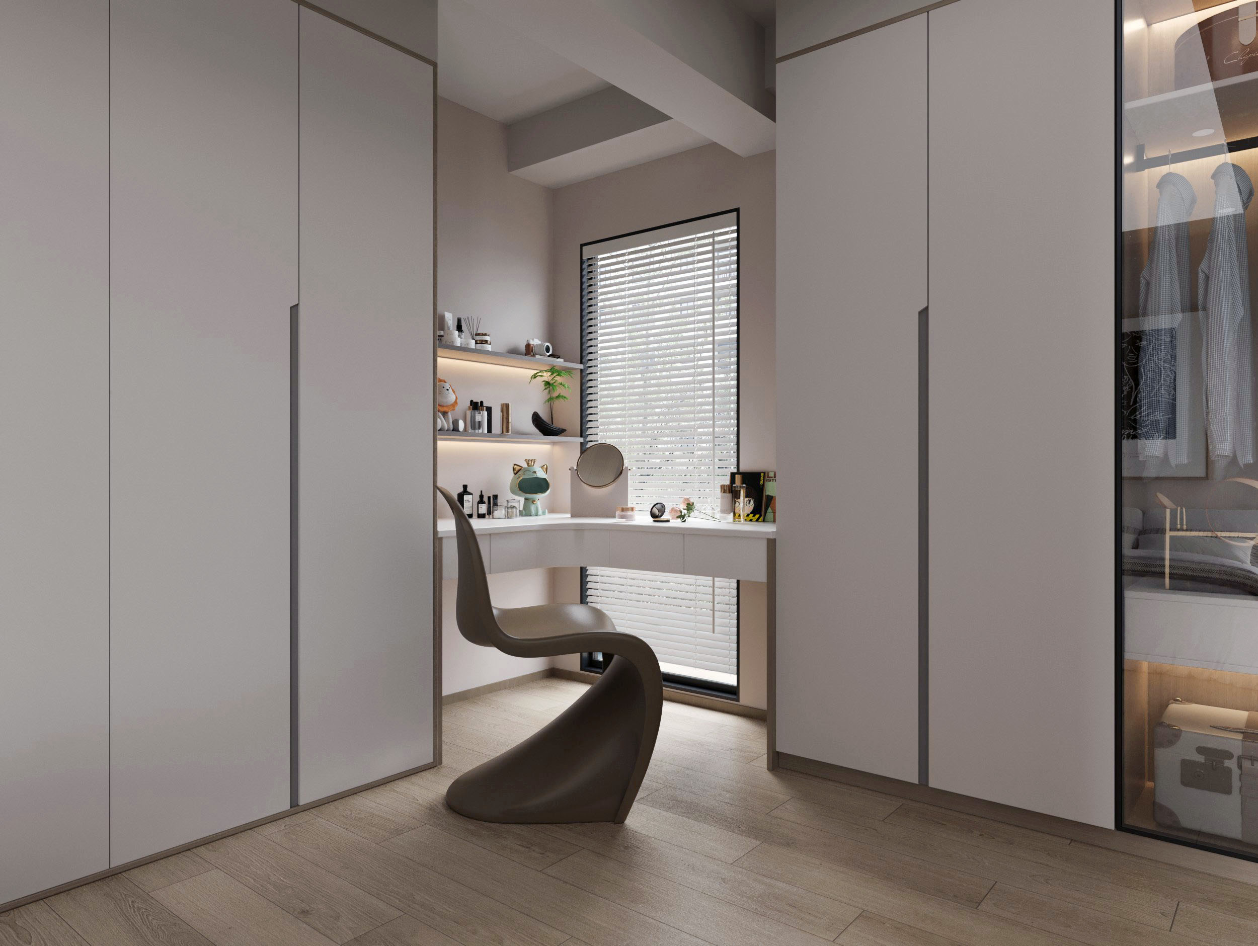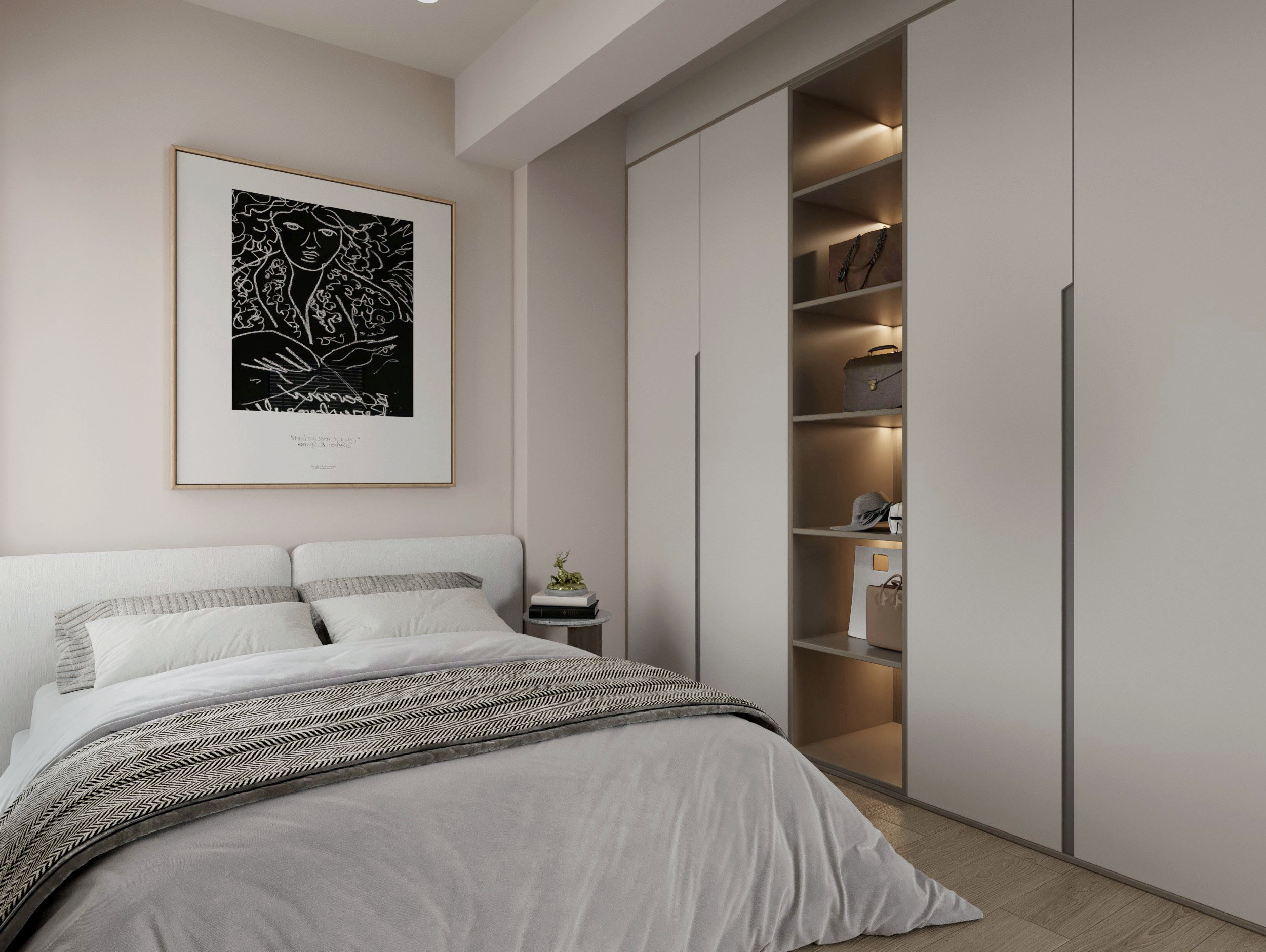 以溫暖的灰白色系和木質紋理為基調,創造出放鬆而寧靜的氛圍。床頭牆面搭配低調的藝術畫作,增添了空間的層次感。內嵌式的收納櫃設計,不僅提供充足的收納空間,更維持了整體視覺的簡潔。衣櫃採用隱藏把手與無縫設計,營造出流暢的極簡美學,並搭配小型開放式展示層架,讓日常物品觸手可及又不破壞整體和諧。
