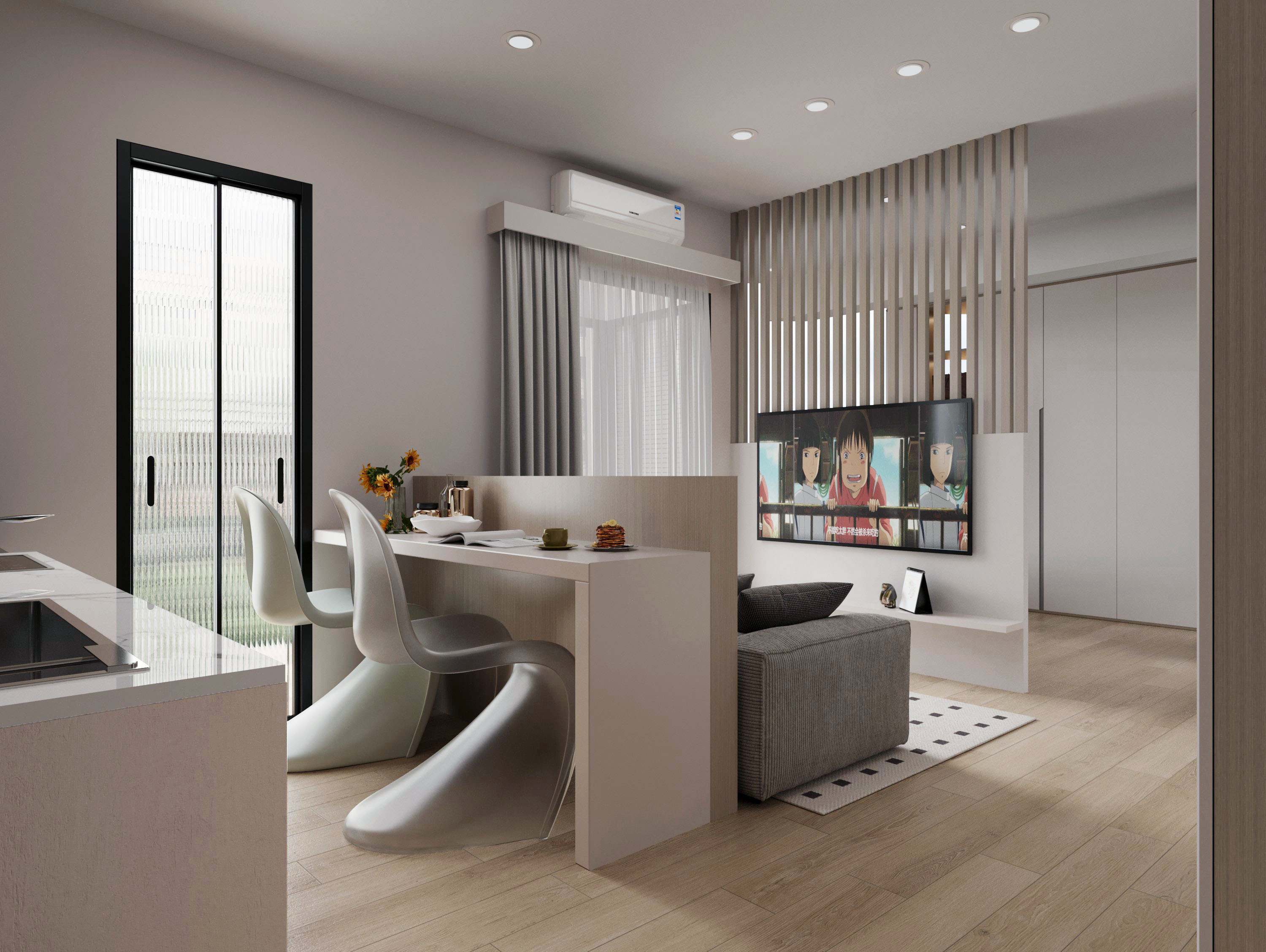透過開放式布局與溫潤的木質地板,營造出平和、放鬆的氛圍。採用隱藏式收納設計與線條簡潔的家具,有效提升空間感,同時保持視覺上的純淨與整潔。電視牆背後搭配格柵隔間,既分隔了區域,又不阻礙光線的穿透,讓整體空間更顯通透。大面積落地窗引入自然光,與柔和的暖色調燈光相互輝映,讓人無論白天或夜晚都能沉浸在舒適與溫馨之中,完美詮釋了功能性與美學的平衡。
