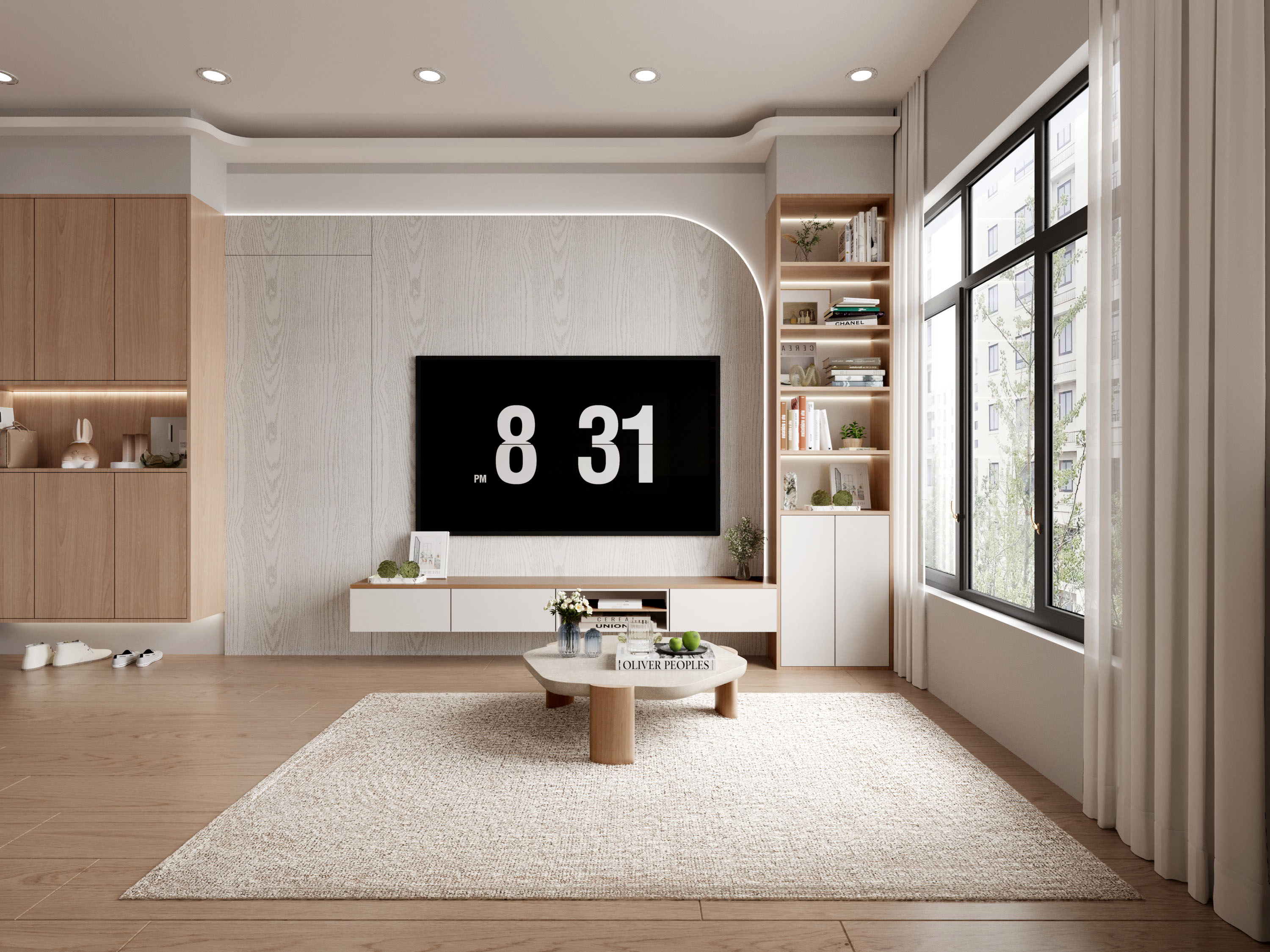 以木質與柔和米色為主調,呈現出舒適且溫馨的現代極簡風格。採用低調簡約的家俱與精心規劃的光線布局,空間顯得更加開闊而不失溫度。客廳與書房以高架設計自然分隔,不僅增添了功能性,也帶來一種自在的生活流動感。圓潤的沙發和弧形燈具細節,為整體注入了一絲柔和的優雅。
