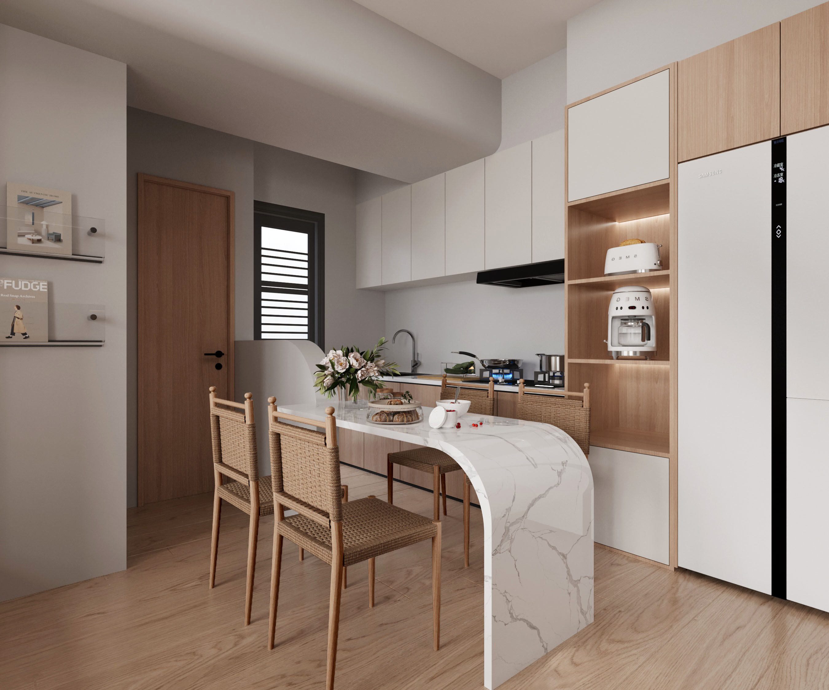 廚房設計透過木質與大理石紋的結合,營造出溫暖又帶有質感的現代氛圍。純淨的白色櫥櫃搭配自然的木質收納架,將簡約與實用完美融合,使整體更顯開闊整潔。大理石紋的弧形餐桌成為視覺焦點,增添一絲優雅的精緻感,且帶來輕巧的用餐區域。