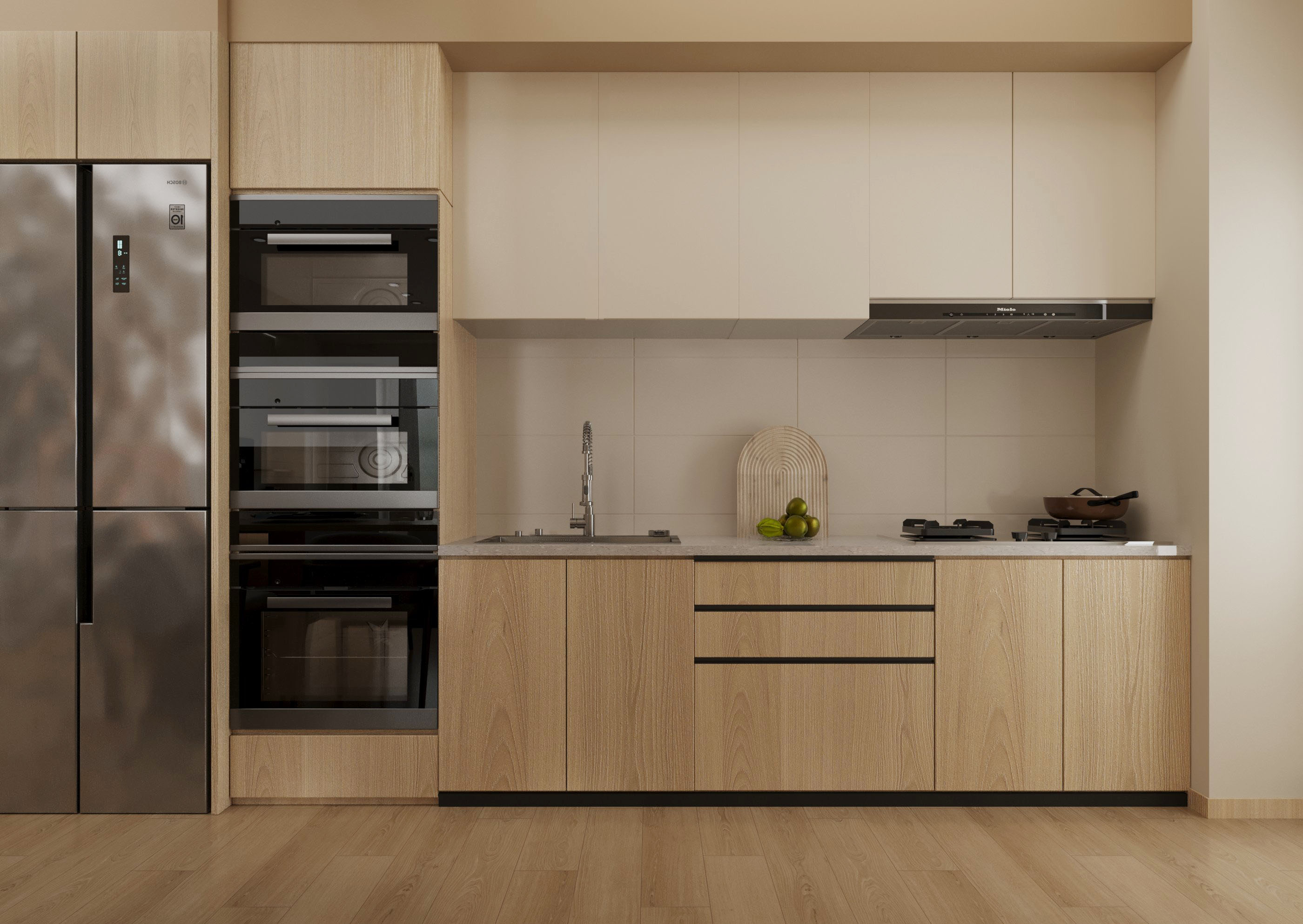 原木色的櫥櫃搭配白色牆面,呈現出明亮且自然的視覺效果。內嵌式電器的設計不僅節省空間,更突顯出整體的整潔感。開放的操作檯面讓料理過程更加順暢,同時提供充足的收納空間,保持廚房的井然有序。這樣的設計不僅提升了使用便利性,還兼顧了美觀與實用,適合追求簡約生活美學的家庭。