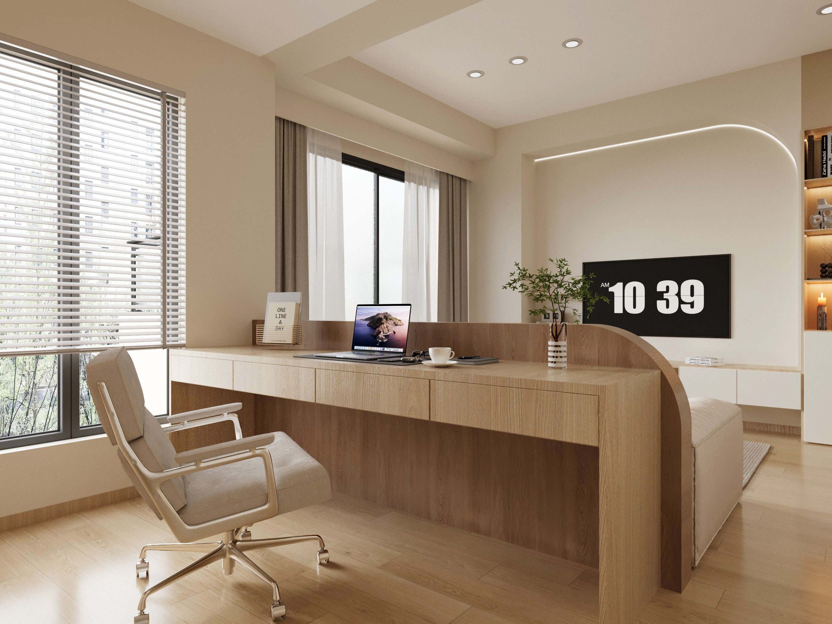 以簡約日式無印風格為設計核心,將實用性與美感相結合。嵌入式木質書架設計,提供豐富的收納空間,同時讓書籍和裝飾物井然有序地展示,增添視覺上的層次感。書桌臨窗而設,自然光柔和地灑入,使空間更為明亮舒適,有助於提升專注力。整體色調柔和,以木質和簡約線條為主,營造出一種靜謐與放鬆的氛圍,為使用者提供了一個理想的工作與閱讀角落。