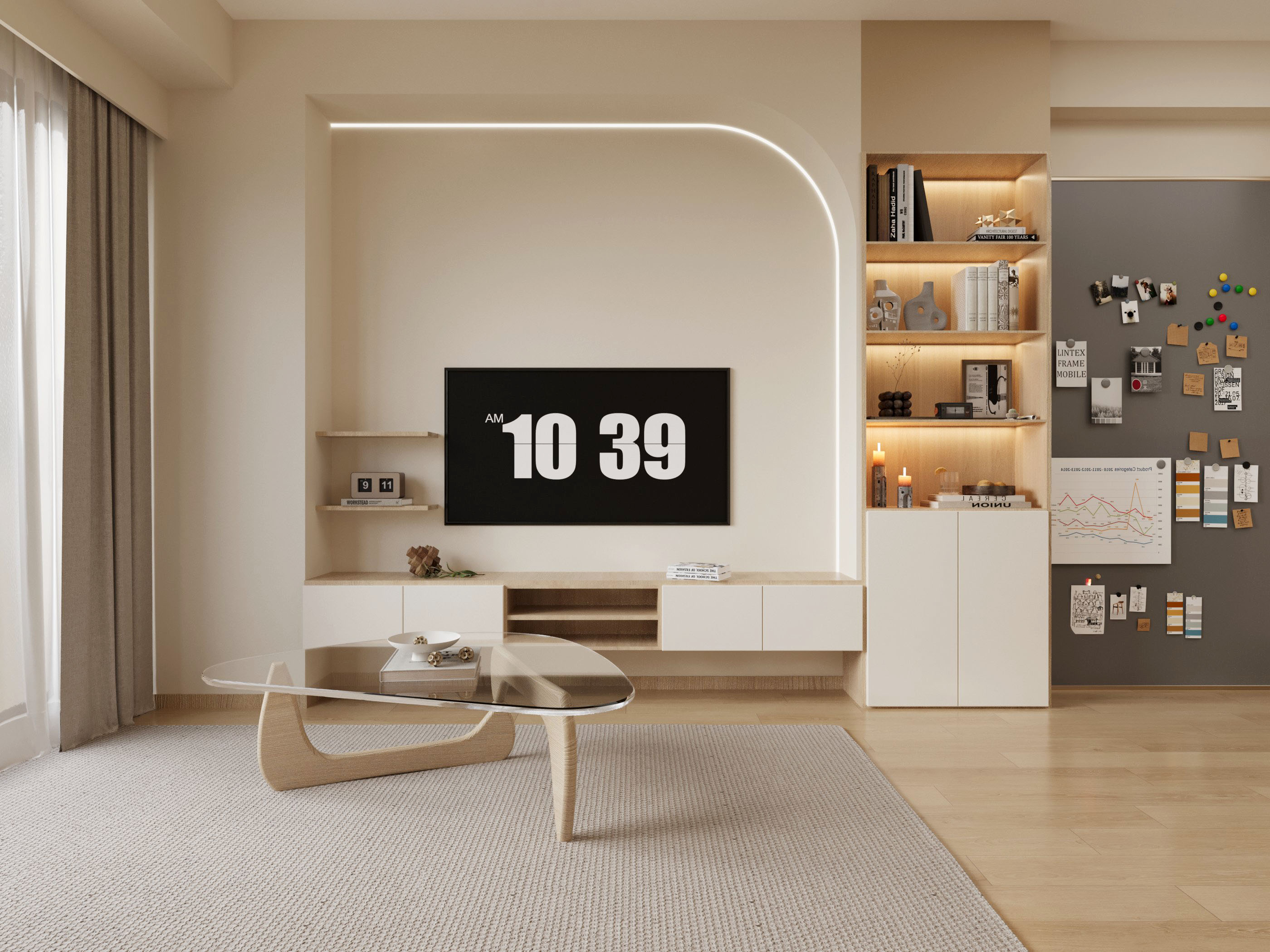 以日式無印風格的簡約美學為核心,強調溫潤自然的氛圍。米色調沙發與木質地板的搭配,帶來視覺上的柔和感,使空間倍感溫馨。電視牆的設計融入了收納櫃與展示架,不僅增加了儲物功能,也為生活增添了一份藝術氣息。透明玻璃茶几輕盈不占空間,與簡約的軟裝風格相呼應。