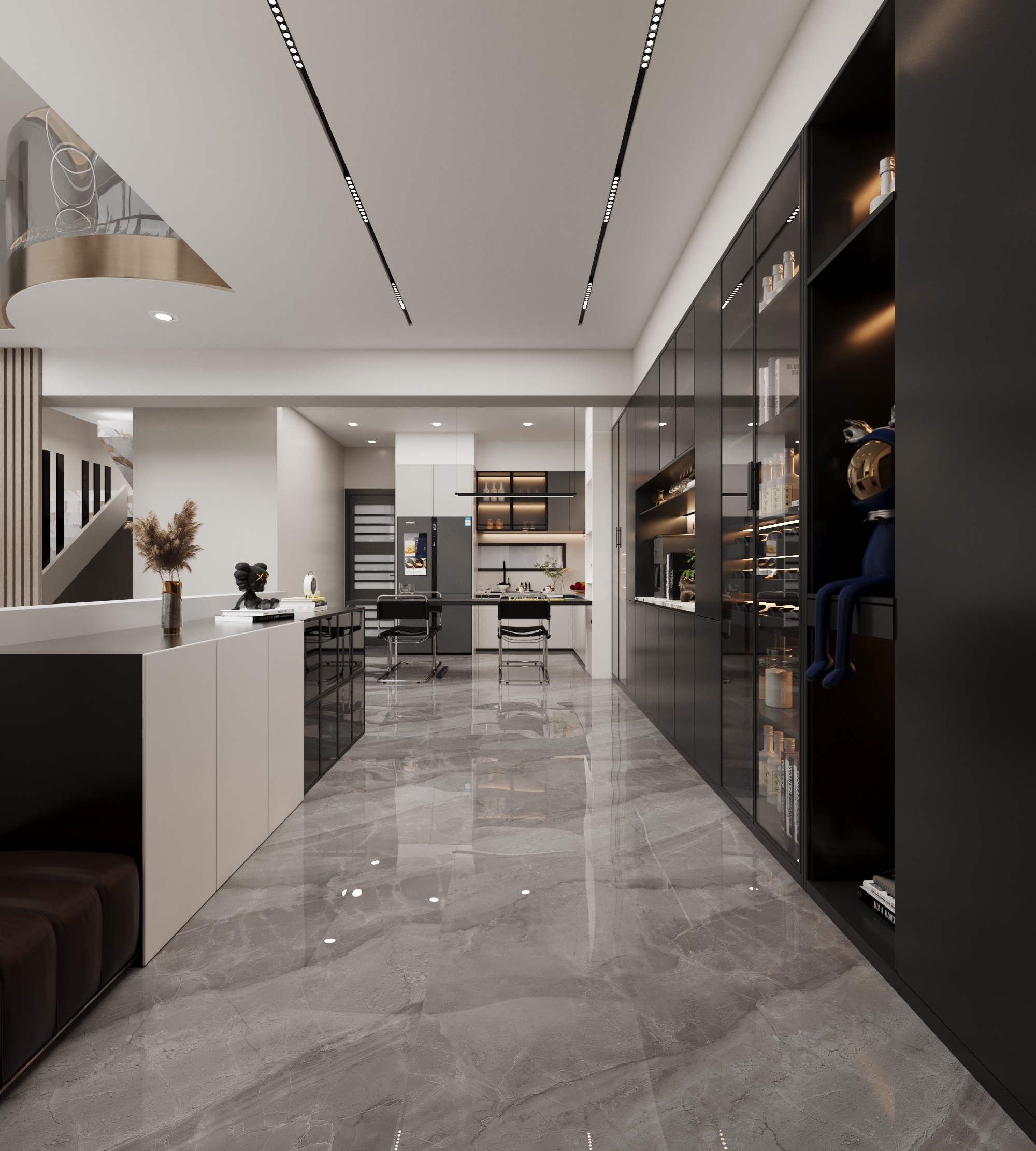 以大理石地板展現出獨特的冷調質感,將簡約與奢華巧妙結合。牆面採用灰白色系,搭配隱藏式的LED燈光,營造出寧靜而富有層次的氛圍。開放式的空間配置,使客廳和餐廳緊密連結,並以中島吧台作為空間區隔,不僅增強了機能性,也讓動線更加流暢。整體家具選擇低調而精緻,以深色調與淺色背景對比,為空間增添視覺張力。隱藏式的收納設計強調整潔,兼具時尚感和實用性。