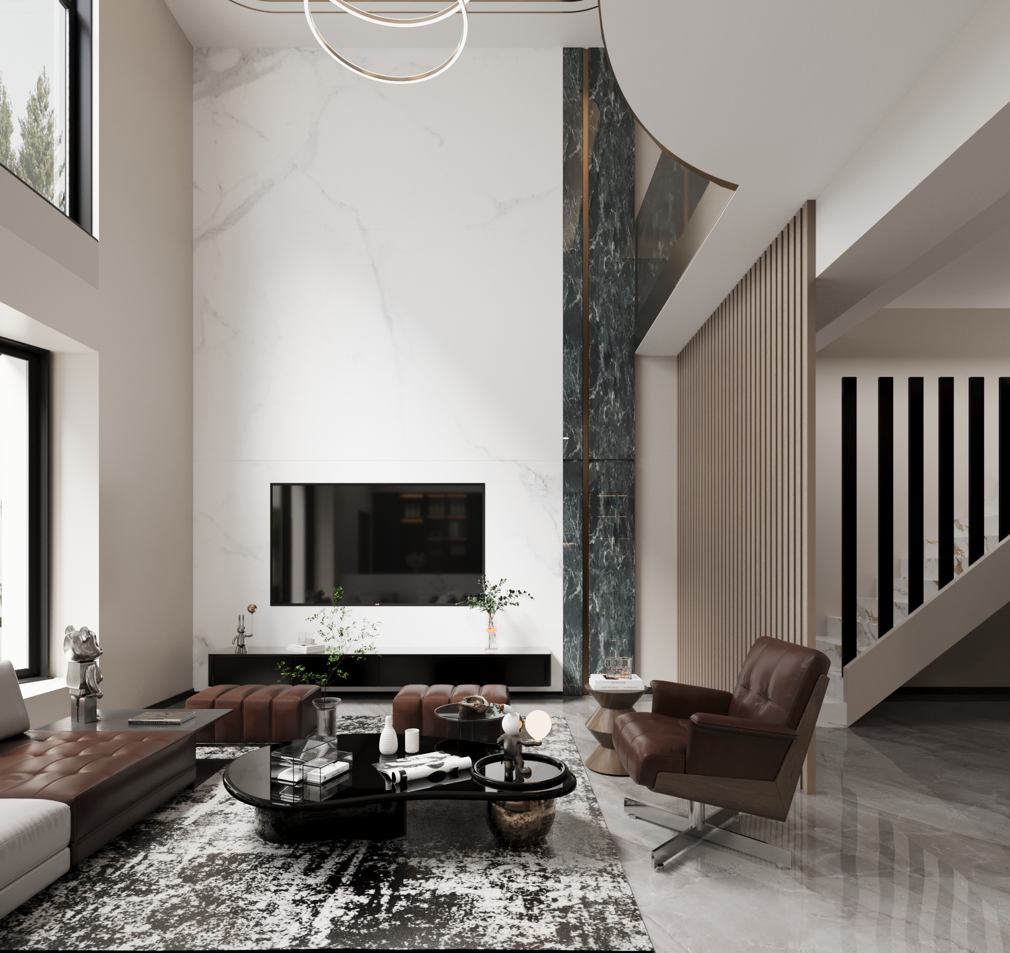 以大理石牆面與地板打造高雅而大氣的空間基調。寬敞的佈局讓空間充滿開放感,並以深色皮革沙發和個性化的擺件突顯時尚氣息。電視牆採用白色大理石與深色紋理交錯,增添視覺對比,營造出層次豐富的空間感受。挑高的天花板與簡約的吊燈,讓整體氛圍更顯寧靜而高級,讓居住者享受精緻的生活品味。