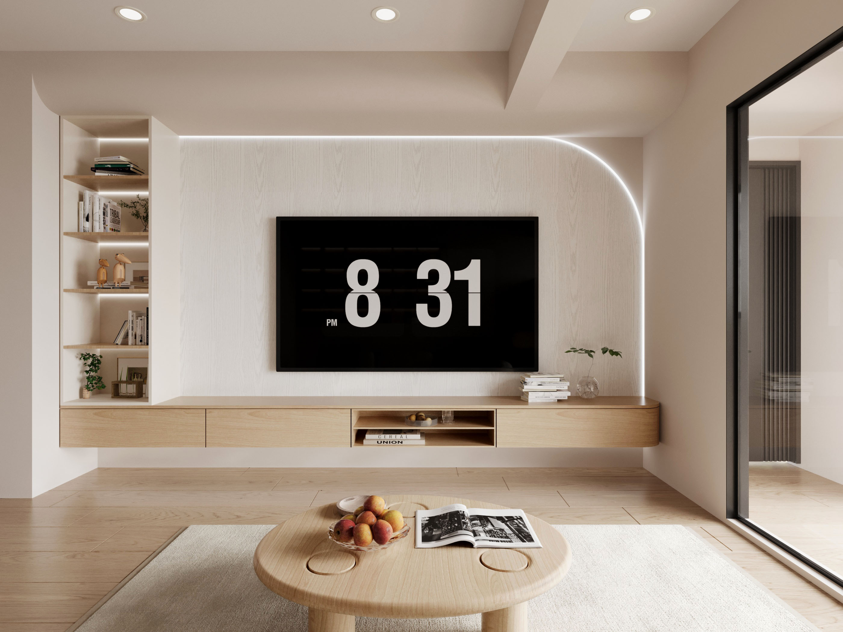 電視牆以木質面板為主,搭配細緻的間接照明,柔化了整體空間的線條感,增添了視覺的層次。牆面的圓弧設計在利落的空間中增添一絲柔和,使客廳看起來既時尚又親切。懸浮的電視櫃提供充足的收納空間,並在視覺上保持整潔,讓視野更加開闊。
