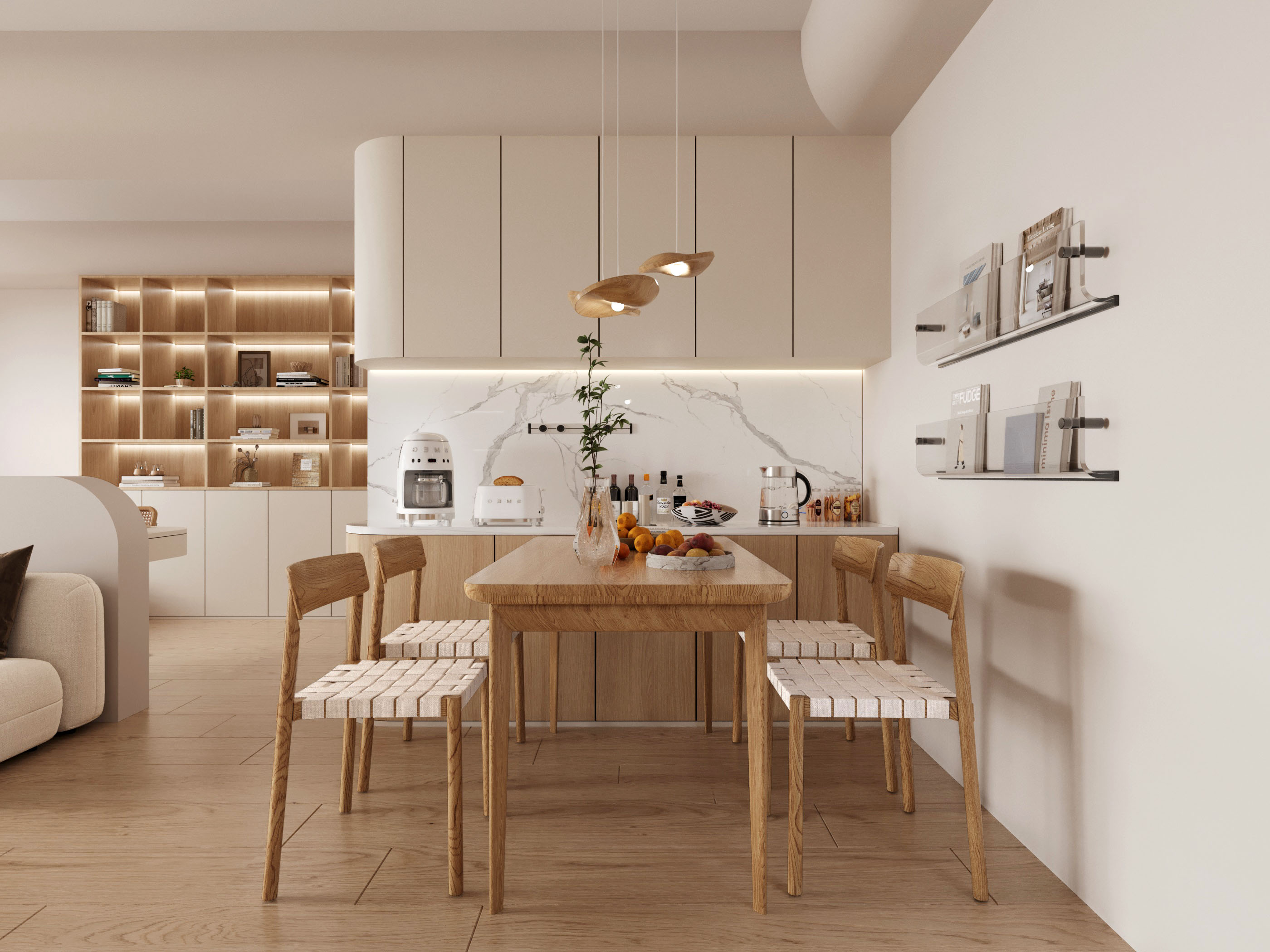 以開放式布局展現空間的延展性,融合現代簡約和日式無印風格,帶來寧靜又舒適的居家氛圍。木質的餐桌和椅子搭配柔和的米白色牆面,打造自然樸實的用餐空間,讓家人和朋友在此互動時感到愜意。