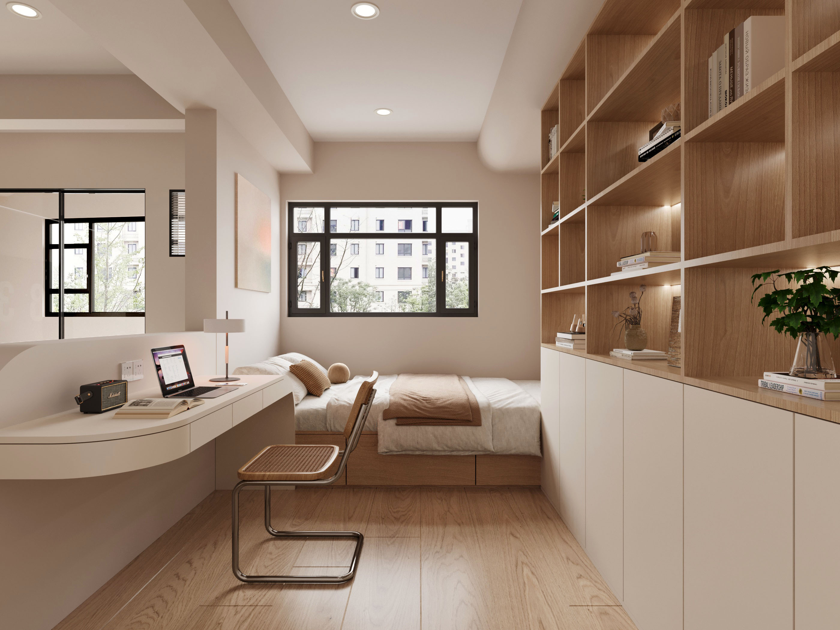 以溫暖的木質調和柔和的米白色為主,完美詮釋了日式無印風的簡約與自然之美。床頭背景牆搭配開放式的書櫃設計,不僅增加了收納功能,也讓空間更具層次感。貼近窗邊的書桌設計,營造出一個靜謐的工作或閱讀角落,在自然光的照射下讓空間顯得更為明亮開闊。整體空間透過細緻的燈光點綴和溫潤的木材紋理,營造出溫馨且放鬆的氛圍,成為理想的休憩場所,讓人從繁忙的日常中獲得片刻的寧靜。